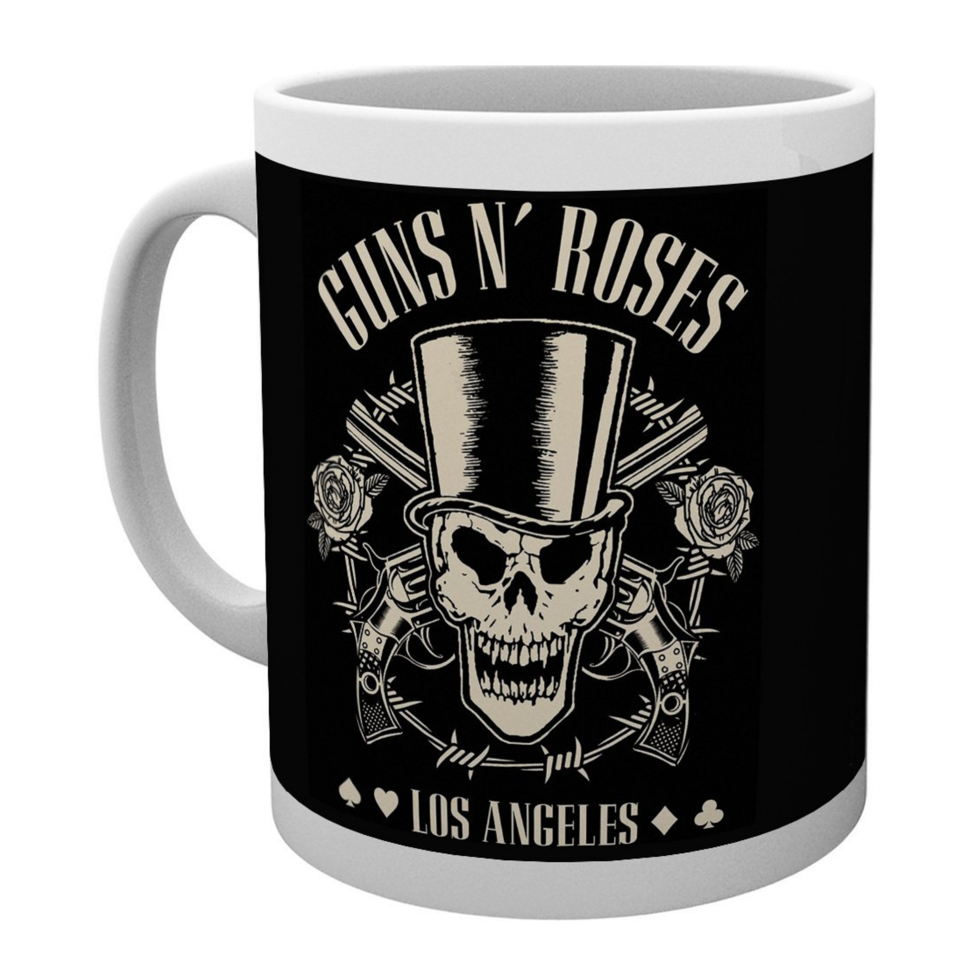كوب أبيض مزين برسومات جمجمة لفرقة غانز آند روزز وشعار لوس أنجلوس